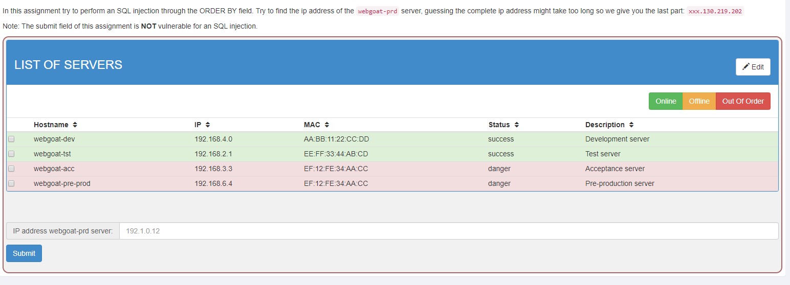 基本上這個題目就是在說,今天我有一串 Server 列表,使用者可以對其 Server 列表進行排序,例如用 Hostname、IP、MAC 等等欄位。現在問題是,要如何透過 SQL injection 找到 Hostname 為 webgoat-prd,及 IP 為 xxx.130.219.202,我們要找出 xxx 這個數字代表什麼才知道整個 IP 為多少。