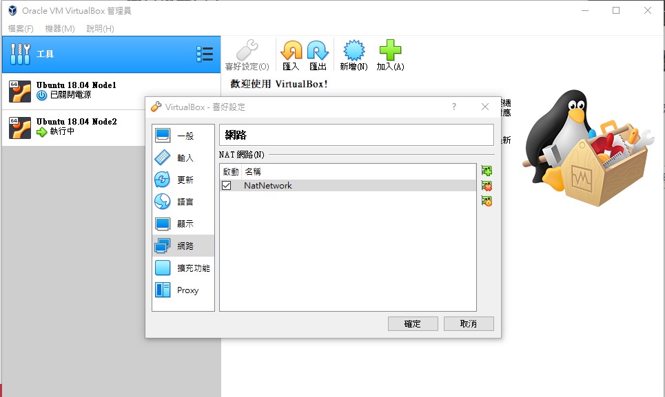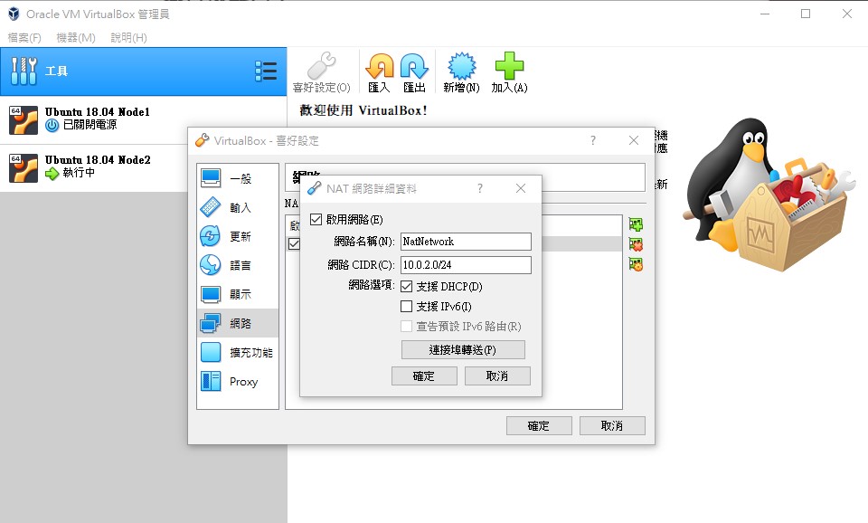 這邊的測試是開啟兩台 Ubuntu18.04 的虛擬機,並且這兩台虛擬機必須互相能夠 ping 的到。這邊我採用 NAT Network 的方式: