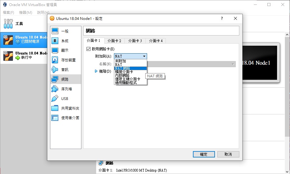 選擇 NAT 網路,這邊就會選擇到你剛剛新增的那個模式。而每個虛擬機只要切換這個模式即可~