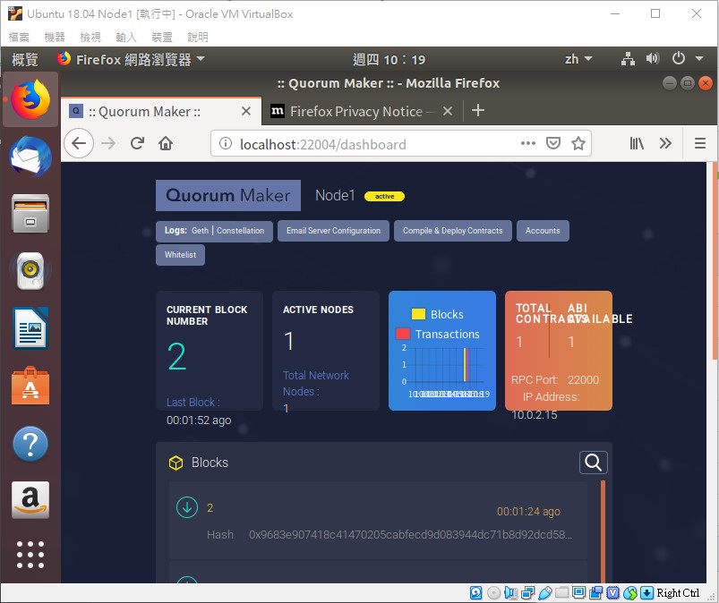 這邊因為沒調客體大小,所以整個虛擬機畫面很小,quorum maker 的畫面有點跑版,但這邊可以看到整個區塊鏈網路的架構只有一個 node,也就是剛剛我們建立的有在運行而已。