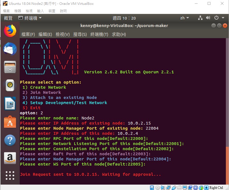 接著,我們開啟第二台虛擬機加入第一台虛擬機的區塊鏈網路