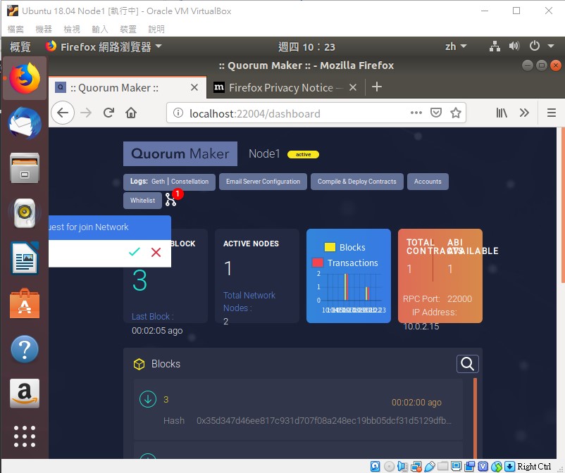 當一切設定好後,會看到上面的最後一行,已經送出 request 給第一台 node,等待這台 Node 的批准才可加入該網路,因此我們再回頭看 Node1 的 quorum maker UI 的時候會看到左邊有個紅色通知,並且你可決定是否讓該 request 進行通過: