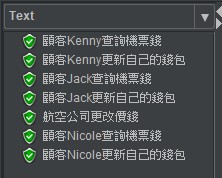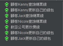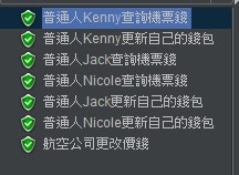 所以到這邊可以理解整個模擬的流程是:三個使用者各自查詢機票價錢,下一步購買機票因此錢包的錢會減少,而公司在同時間也會進行機票價錢的更改。
