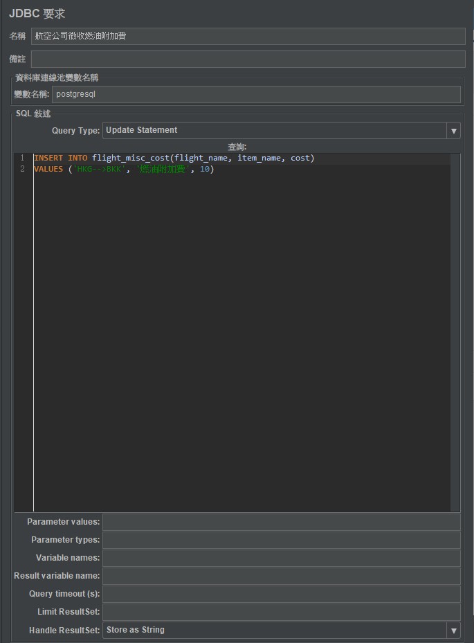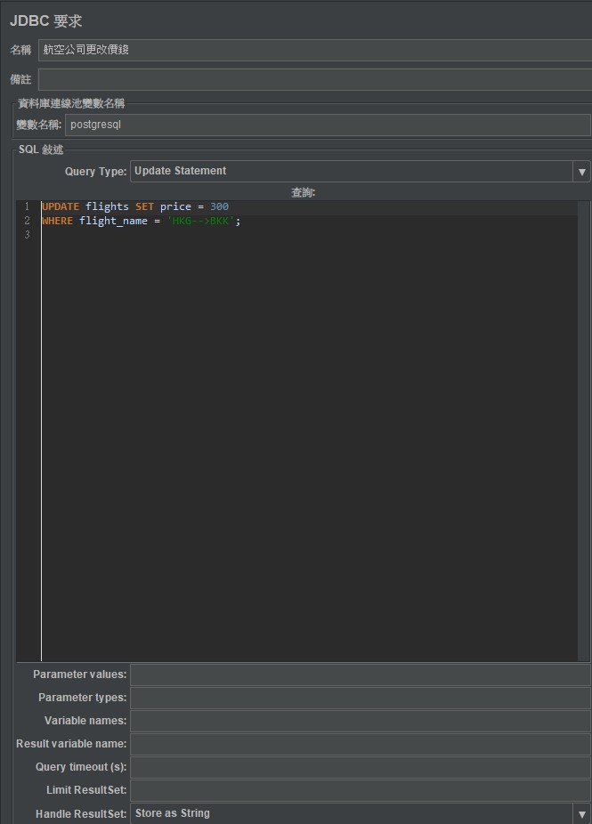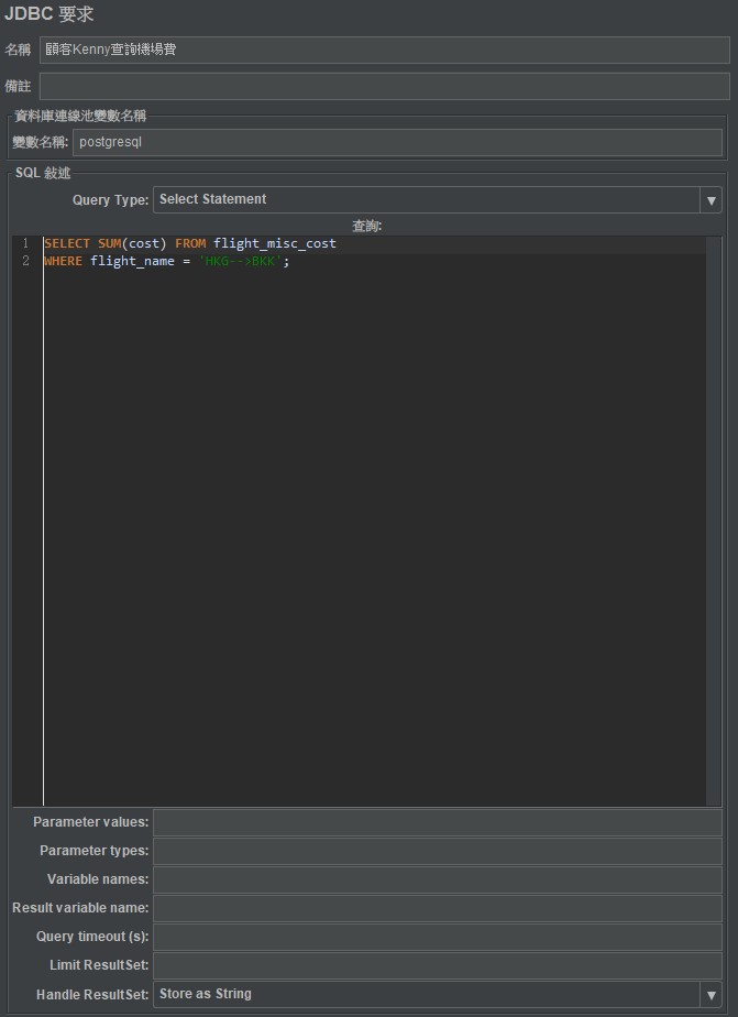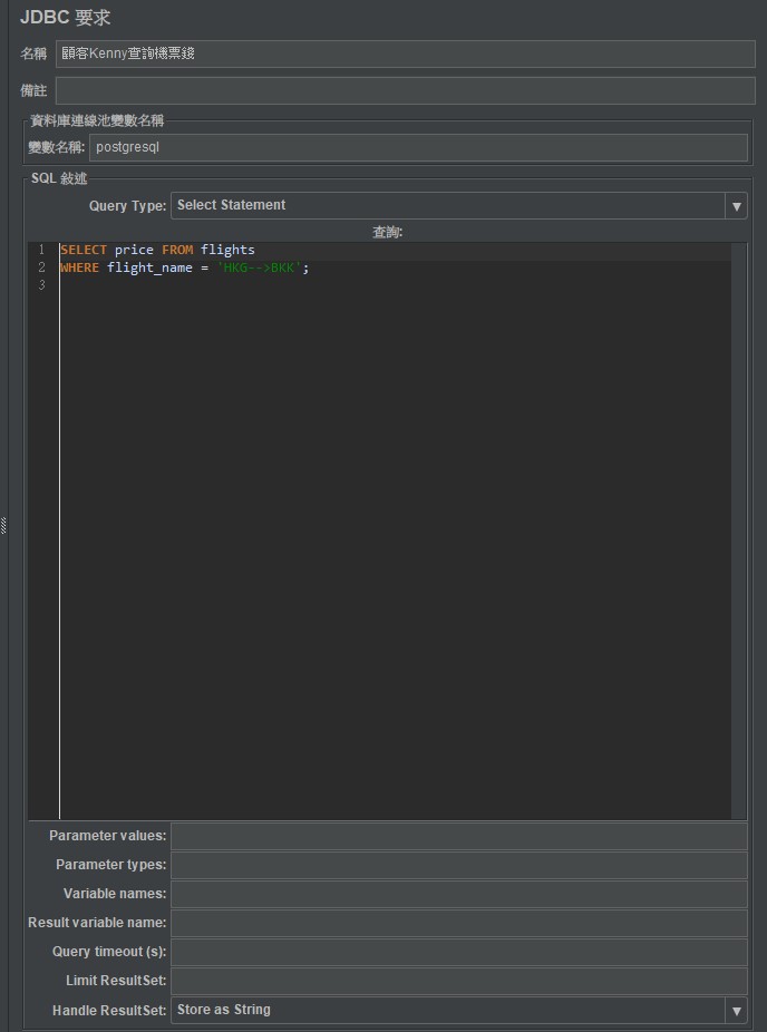 首先注意,變數名稱,這邊就是剛剛說的,要填入你在 JDBC 連線設定那邊填入的變數名稱一模一樣才行,JMeter 才能找到。
