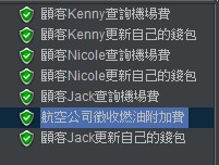 三位顧客會先有查詢機場費的動作,在來更新自己的錢包,而航空公司會有對同樣的機場費多插入一筆費用的動作。