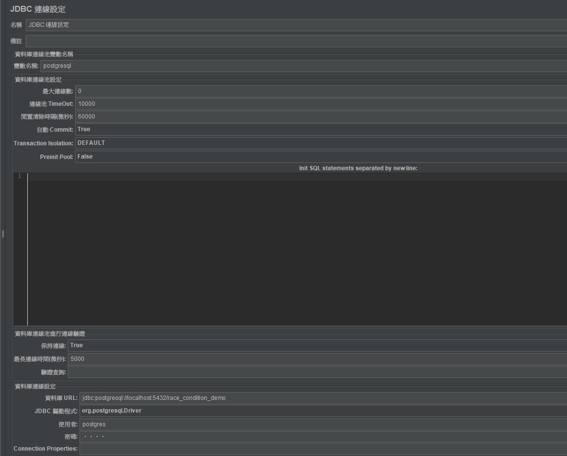 首先在測試計畫下面新增一個 JDBC 連線設定,其裡面的設定內容如下: