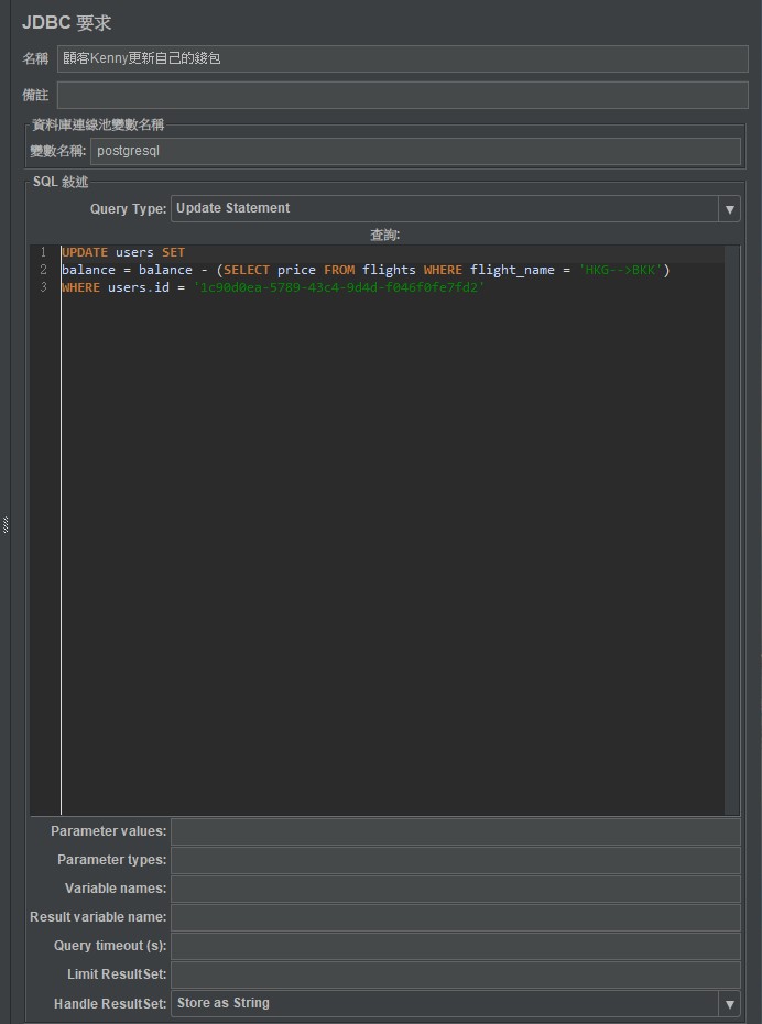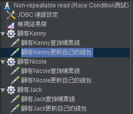 所以可以注意的是,這邊採用的是拿取總成本,因此會用到 SUM 語法。這邊一樣模擬三位顧客的方式,每個顧客會有兩個 JDBC Request。而為了之後測是好看出來 Race Condition,建議先將資料庫的三位使用者的 balance 都設為 60 元。因為如果沒遇到 Race Condition,則查到的總成本是 50 元,因此最後顧客會剩下 10 元,然而如果遇到 Race Condition,顧客最後會剩下 0 元,因為中途航空公司多插入了一筆費用。